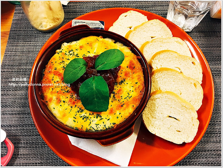 主餐是魁北克鐵道人派。我們來這家餐廳主要就是想吃點不一樣的食物,這道菜的名稱就很吸引我們,就是馬鈴薯肉醬+焗烤,搭配主廚的特製洋蔥醬,可以單吃也可以搭配麵包&奶油吃,洋蔥醬我覺得超好吃的,整體搭配很不錯。