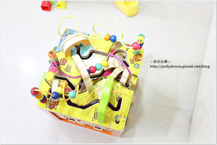 我一直都超想買這種玩具,在托嬰中心或是親子館基本上都會看到這樣類似的教具,一個大大的四方體,四面+上方都是不同的遊戲,是一款豐富又多樣化的玩具。