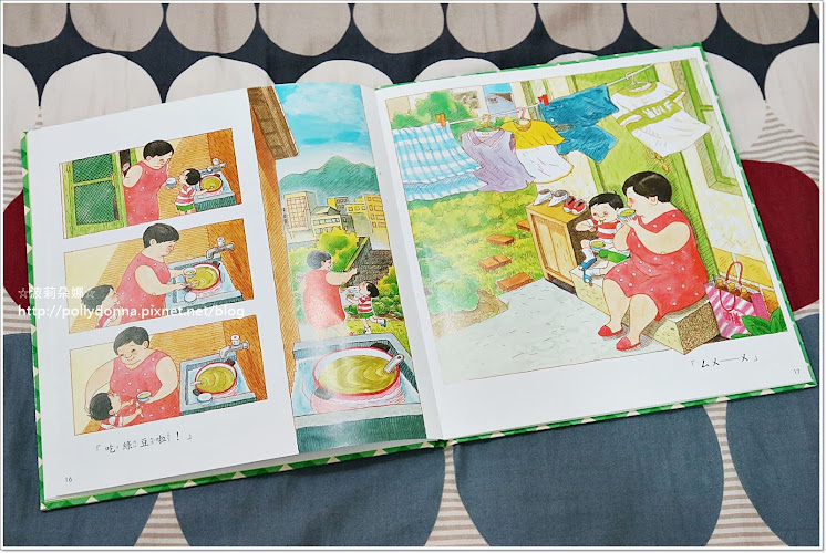 這本書描述阿寶和媽媽的日常生活,市場買菜、買綠豆、煮綠豆、喝綠豆湯、種綠豆。