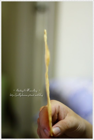 之後將內餡包在麵糰中,捏成圓,在用桿子桿的薄約0.1cm、長約22cm就完成了