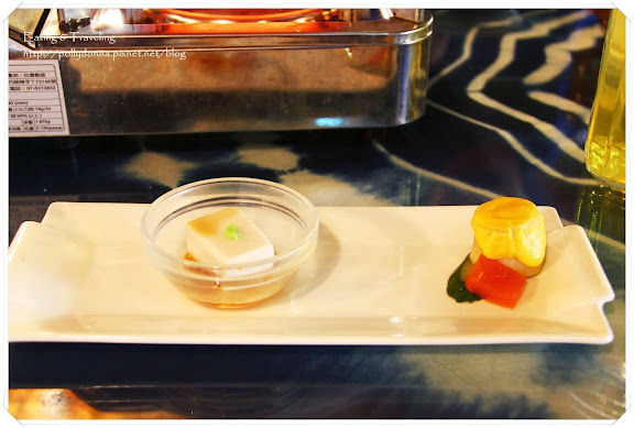 前菜是豆腐和杏鮑菇,冷豆腐淋上清爽的醬汁,是比較紮實一點的口感,杏鮑菇被起司包覆,蠻特別的。