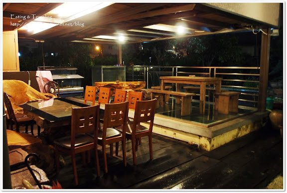 餐廳用的都是檜木桌椅,整個餐廳的裝飾也以檜木藝術品為主。如果天氣好,可以選擇坐在戶外座位,氣氛還不錯,上面那個座位地面是透明的玻璃,底下是水池,可以看見魚在游,不過像今天下雨地濕濕的,如果站在玻璃上會有點滑。