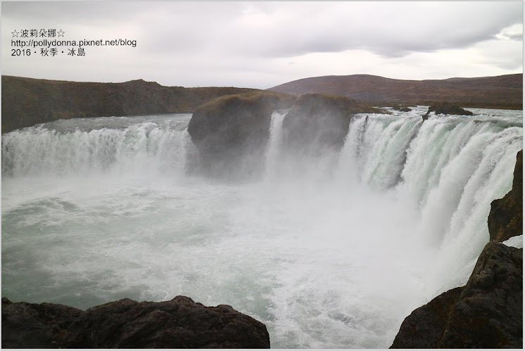 Goðafoss是略呈現圓弧形狀的瀑布,淡綠色水流,水花濺起週邊霧濛濛一片。