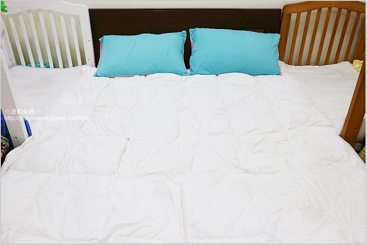 我們的床是這樣兩邊併嬰兒床,除了有異膚體質的瘦肉粥,還沒滿2歲的Emma姊姊也常常會在上面打滾。把INN HOUSE羽絨被舖在床上超適合打滾。